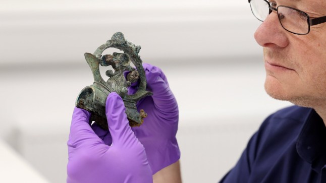 Play Video EMBARGOED TO 0001 TUESDAY MARCH 25 Undated handout photo issued by Durham University of Professor Tom Moore, head of archaeology at Durham University, holding up a decorative copper alloy finial. A huge Iron Age hoard discovered in a Yorkshire field by a metal detectorist could lead to a revaluation of the wealth and status of the elite living in northern Britain 2,000 years ago, an archaeologist has said. Issue date: Tuesday March 25, 2025. PA Photo. See PA story HERITAGE Melsonby. Photo credit should read: Durham University/PA Wire NOTE TO EDITORS: This handout photo may only be used in for editorial reporting purposes for the contemporaneous illustration of events, things or the people in the image or facts mentioned in the caption. Reuse of the picture may require further permission from the copyright holder.